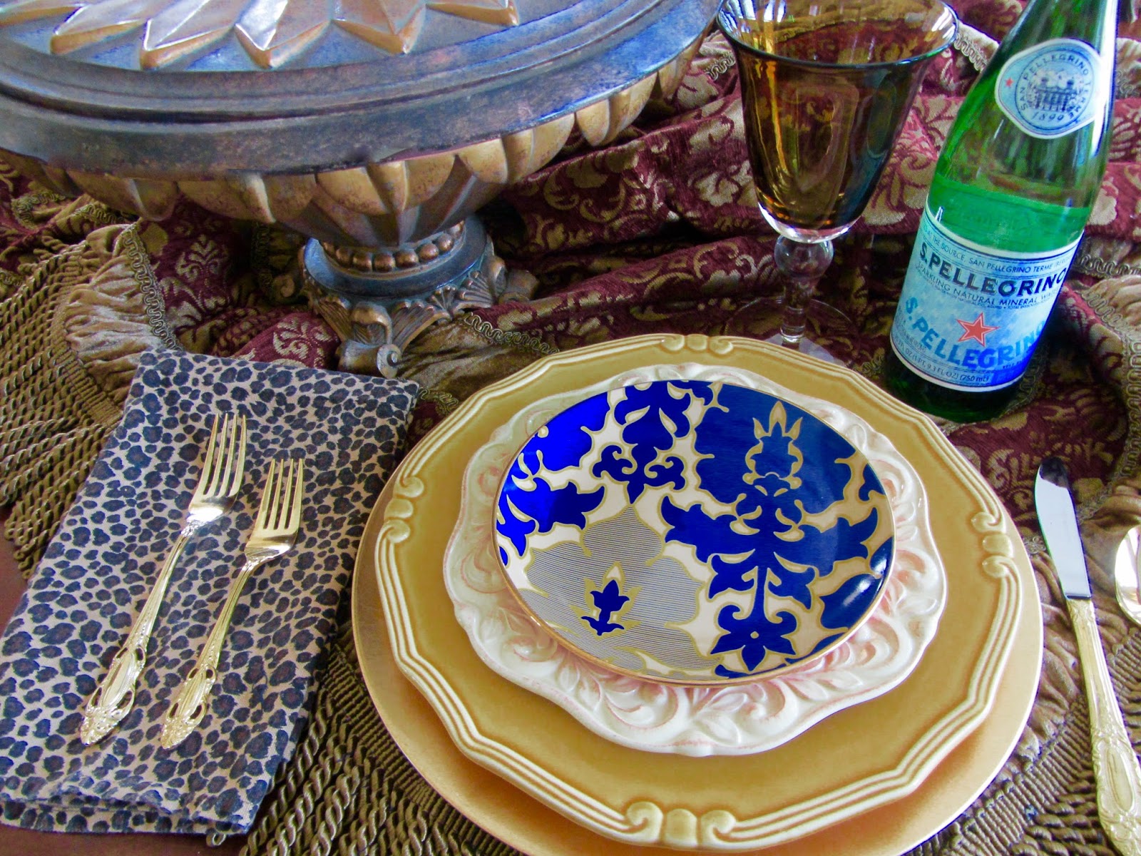 Day 2...The theme was, "Pattern". I shared a place setting using a mix of patterns and textures. I have always loved the stylings of Charles Faudree and Ralph Lauren, when it comes to mixing patterns. As always, I began with a table cover. This one had plenty of pattern and texture. I layered it with a gold charger, a vintage Williams-Sonoma dinner plate, a heavily embellished plate, and a patterned dessert plate by Tracy Reese. I added a touch of whimsy with a leopard print napkin. The patterns are all so different; but, somehow, they still work together.